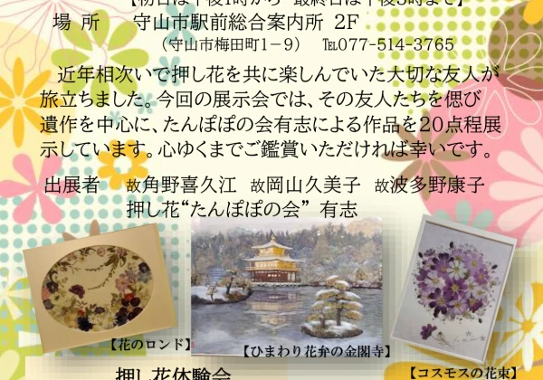 近年相次いで押し花を共に楽しんでいた大切な友人が旅立ちました。今回の展示会では、その友人たちを偲び遺作を中心に、たんぽぽの会有志...