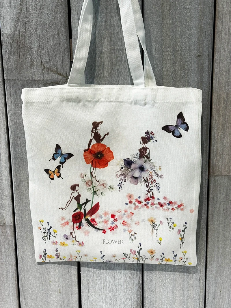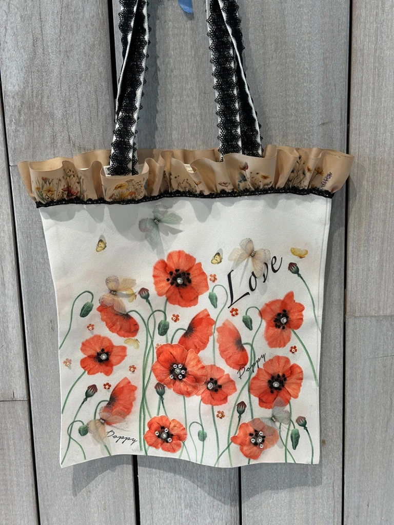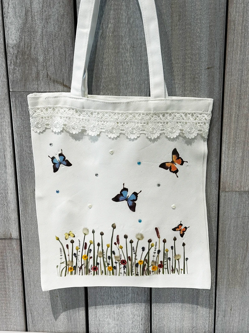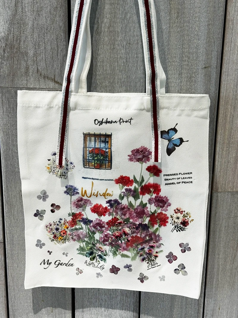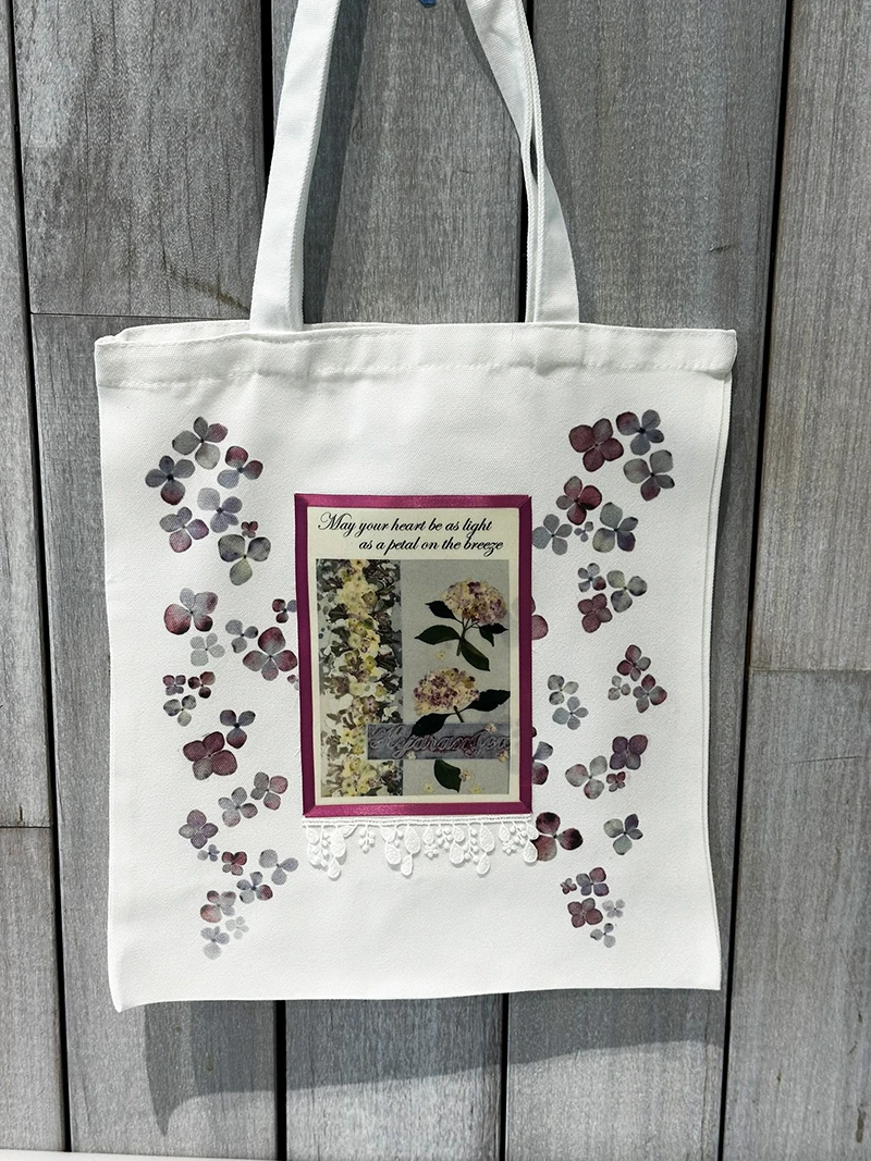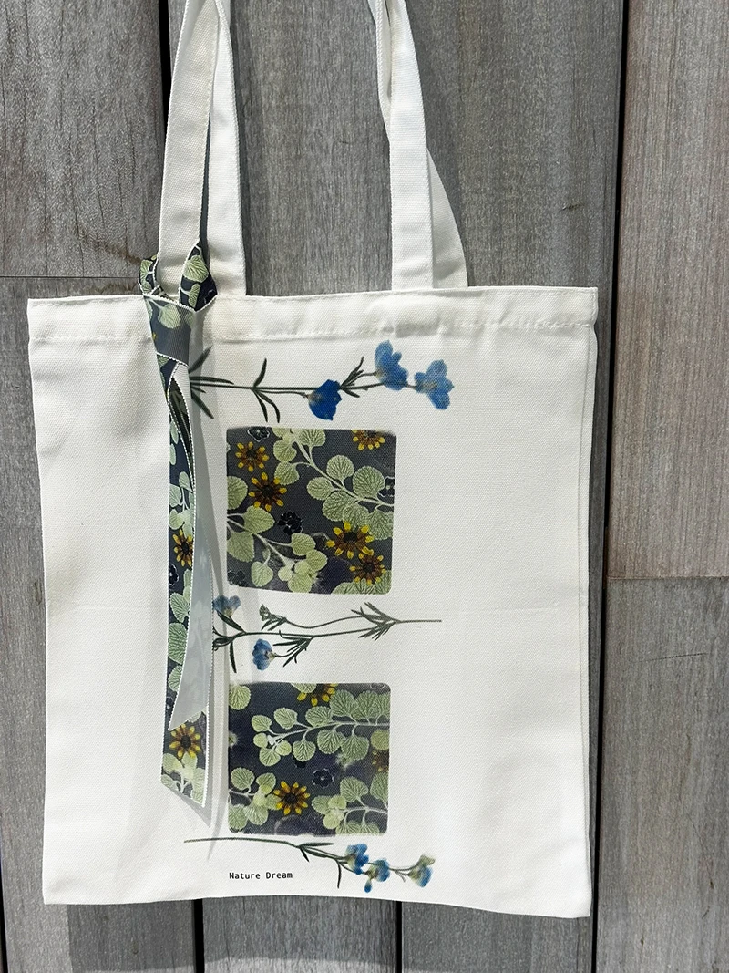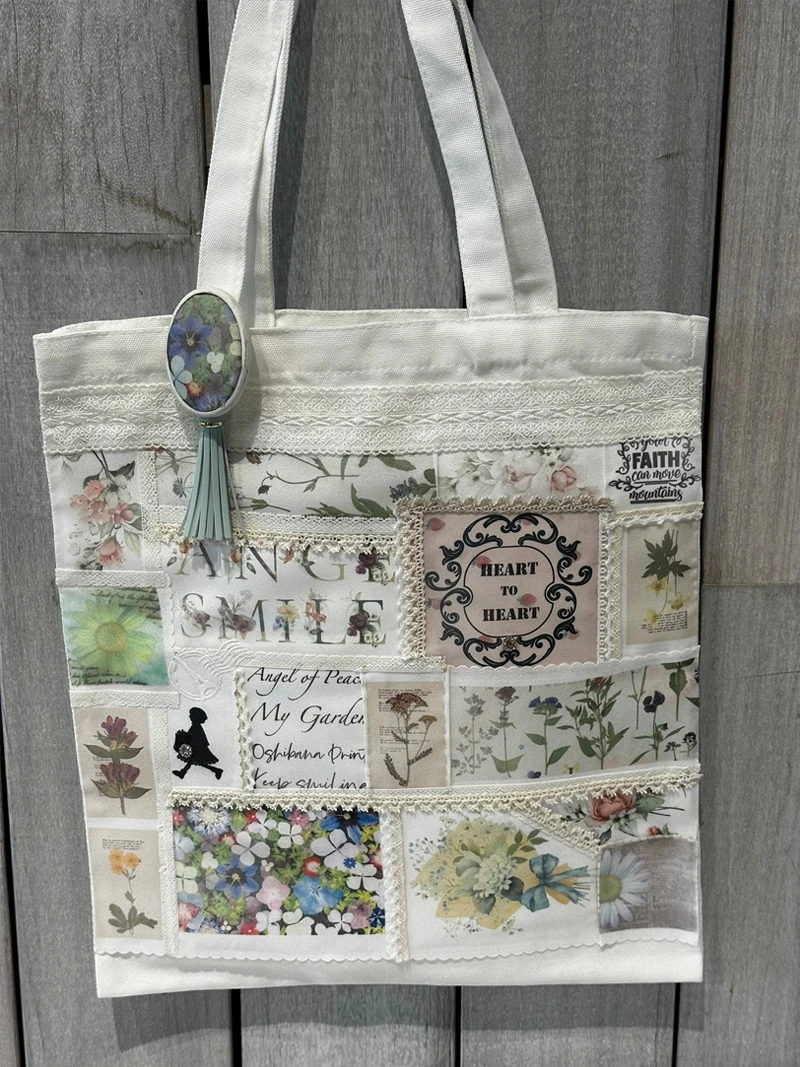 押し花プリントのSDシート(オリジナルSDシート含む)を使い、実用的なトートバッグを作りました。優しい色のモチーフをつなげています。