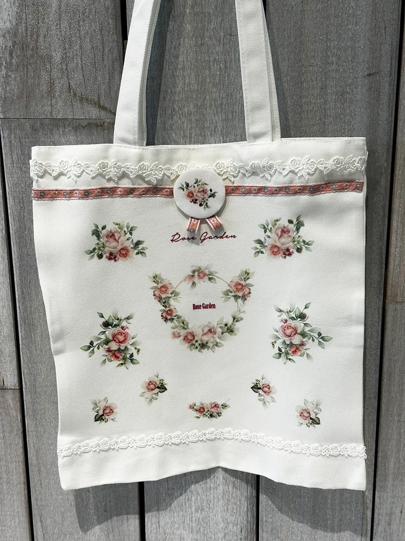 ピンクのバラに私の好きなレースやリボンをプラスして可愛いバッグに仕立てました。見て下さった方々に可愛いって感じてもらえると嬉しいです。