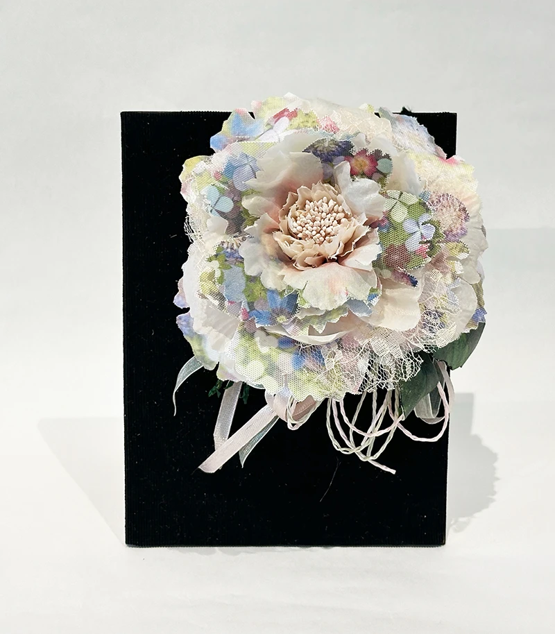 花柄の台紙とレディースの台紙を組み合わせて花柄を来ているようにアレンジし、周りに様々な花をちりばめました。華やかさを出すのにクリスタルを追加したり、リボンを付けました。
