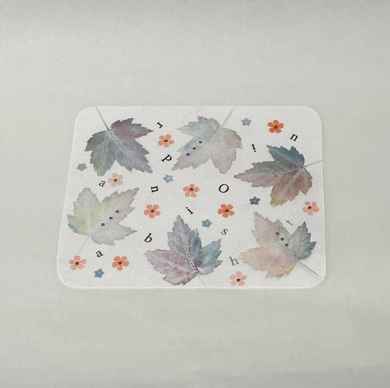 マイクロファイバークロスに葉脈のはっきりした葉を色々な色をのせて遊んでみました。色が思ったように出なかったりと苦労しましたが、小花や英文字などを加えて楽しい作品になりました。