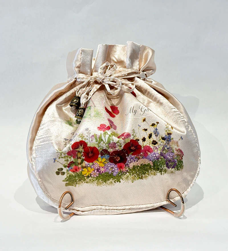 自分が持つならこんなデザインがいいな、というイメージで押し花プリントしました。リボンにもプリントして、持ち手に、可愛くなりすぎたいように、ネクタイ風に結んでみました。