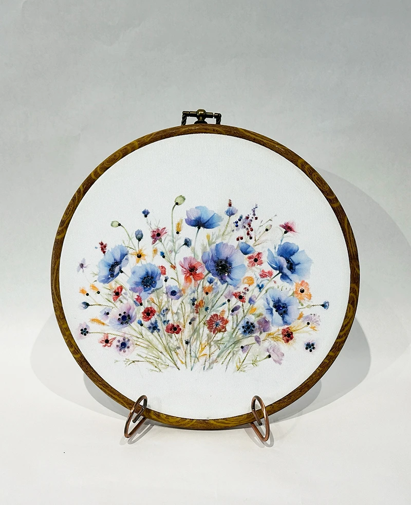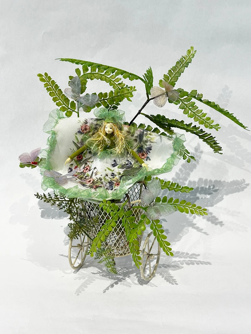 コクリコの鮮やかな押し花プリントを使いたくて制作しました。手前の花は下にコットンを入れて立体にし刺繍やビーズ、レースを添えて華やかに。上のフリルもリボンに押し花プリントがしてあります。