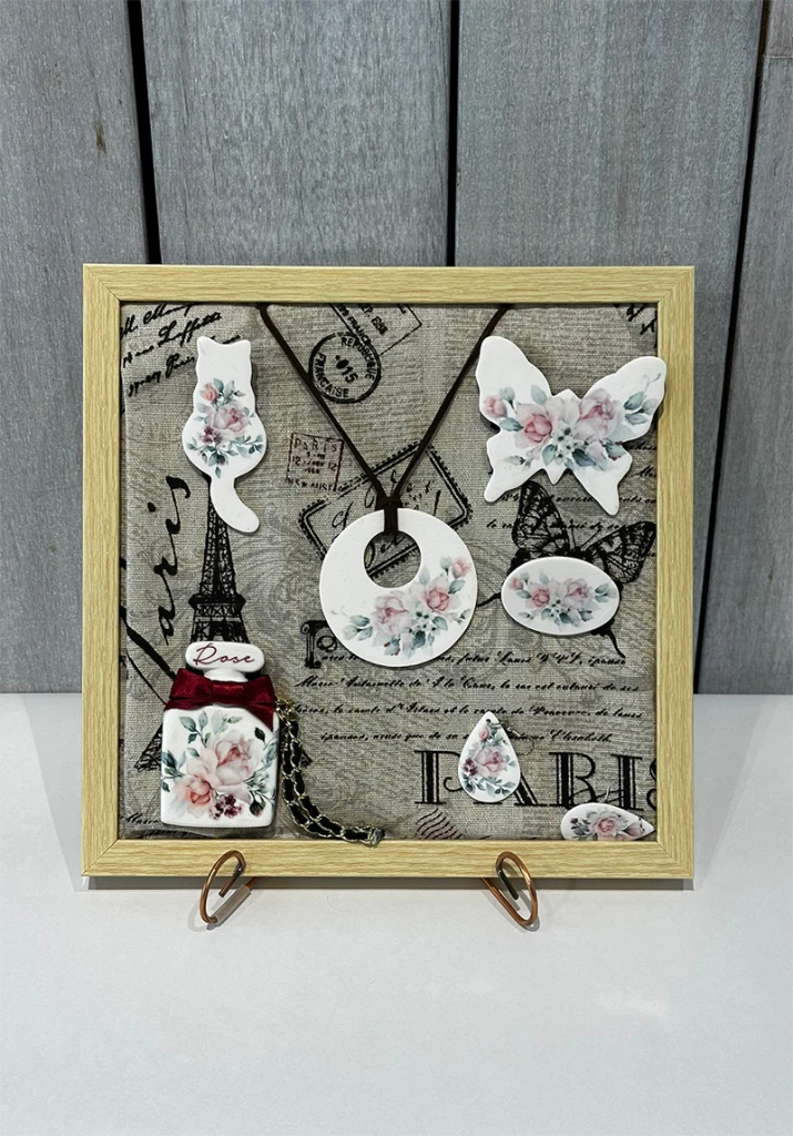 大好きなローズの押し花プリントをブローチ、ペンダント、ピアス、バックチャームにプリントしてみました。