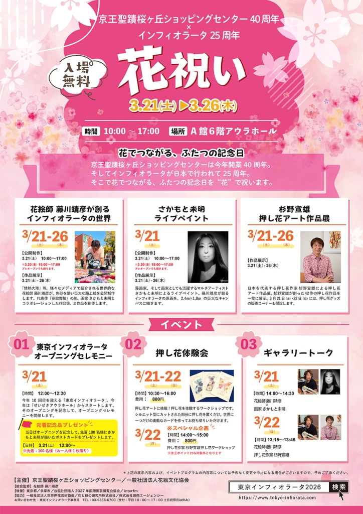 今年、京王聖蹟桜ヶ丘ショッピングセンターは開業40周年、インフィオラータ(敷き詰められた花の絨毯)が日本で行われて25周年を記念して、イベント「花祝い」が開かれます。会場展示ではインフィオラータの世界を紹介するほか、花絵師 藤川靖彦さんとのコラボレーション企画として、杉野宣雄先生の作品展示、ギャラリートーク、押し花体験会など、楽しい企画がいっぱい。ご家族やご友人と、ぜひお気軽にお出かけください!